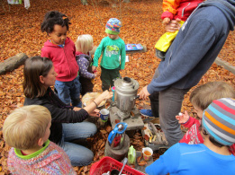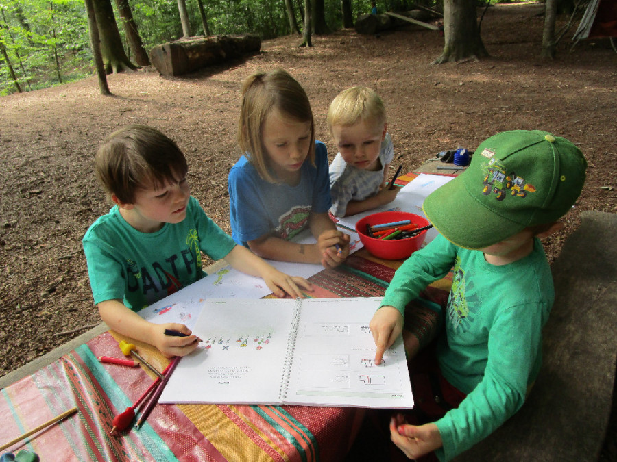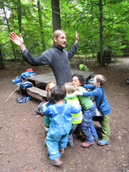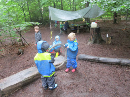 Es regnet. Zwei Kinder halten je eine Stange, während ein Kind die Heringe verteilt, mit denen zwei Erzieher das Tarp gleich neben einem Teich aufspannen. Kaum steckt ein Hering im Boden springen schon ein paar Kinder lachend unter der flatternden Plane durch. Ein Regenschauer hat uns überrascht und unterm Tarp finden wir alle einen trockenen Platz fürs Vesper. - - - Mit Instrumenten ausgerüstet läuft die Räubergruppe durch den Wald. Ein Erzieher singt ein paar lustige Reime in ein Bananenmikrofon, welche mit schallendem Gelächter der Kinder beantwortet werden. Man könnte meinen, hier wird ein Fest gefeiert, wir feiern aber einfach nur den Moment, das Leben, die Musik! - - - Auf dem Tisch verstreut liegen neben Kulleraugen und Glitzersteinchen verschiedene Werkzeuge und Hölzer. Eine Praktikantin arbeitet mit einer Gruppe von Kindern an deren Kunstwerken aus Holz und diversem Bastelmaterial. Mit einem dünnen Handbohrer wird ein Loch in einen Ast gebohrt, so dass ein Stück Pfeifenputzer als Arme hinein gesteckt werden kann. - - - Drei Kinder und unsere Praktikantin haben sich um eine große Schüssel versammelt. Ein Junge schlägt gerade Eier in den orangenen Spätzleteig. Orange ist er wegen des Hokkaidokürbis, den wir zuvor püriert hatten. Nebenan steht ein großer Topf voll Wasser auf dem Feuer, worin wir später die Kürbisspätzle kochen werden. - - - In der Kuschelecke wickelt ein Kind einem anderen einen Verband um. Ein erste-Hilfe-Koffer liegt neben ihm. Ganz ruhig spielen sie miteinander. - - - Ausgelassenes Gelächter schallt von einer Kindergruppe herüber. Mit einem kleinen Wägelchen saust ein Mädchen ein schräg an einen Baumstamm gelegtes Brett hinunter. Auf dem Stamm stehen einige andere Kinder und johlen freudig hinterher. Dann kommt die Mutter des Mädchens und man sieht das Grüppchen Kinder mit ihr noch ein Weilchen zusammen stehen und reden. Denn eigentlich will die kleine Räuberin doch noch gar nicht nach Hause.