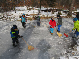 Eine eisige Woche liegt hinter uns. Morgens früh um 7:30 Uhr maß das Thermometer zeitweise -15°C. Bei diesen Temperaturen passiert etwas, das einen ganz neuen Spielspaß ermöglicht: die Teiche im Wald frieren zu. Bisher hatten wir erst einen Winter, in dem die Eisschicht dick genug war und die Eisfläche glatt genug, dass man auf ihr rutschen und schlittern konnte, das war der erste Räuberhöhlenwinter im Jahr 2011/12. Und nun war es wieder soweit, spiegelglatt breitete sich die Eisfläche vor uns aus und nach den ersten vorsichtigen Rutschversuchen hatten bald alle Kinder die nun begehbare Teichfläche für sich entdeckt und mit ihr neue Spielmöglichkeiten. Mit Anlauf vom Rand rutschten sie auf Knien und Bauch über den Teich, ließen Eisstücke und Stöckchen schlittern, untersuchten in der Eisfläche eingefrorene Gräser, Stöcke und Blätter oder wirbelten mit viel Balancegeschick auf ihren Füßen übers Eis. Um die Eisfläche von kleinen Schneeflocken und Blättern zu befreien nahmen wir einige Besen mit. Da nutzte ein Junge seinen Besen, um ein Stöckchen damit anzustupsen, damit es übers Eis schlitterte. „Komm, wir spielen Eishockey!“ rief er begeistert! Und schon entstand ein bewegungsreiches Spiel, bei dem auch wir Großen begeistert dabei waren. Schnell bildeten sich zwei Mannschaften, meist viele Kinder gegen einen Erwachsenen mit nur ein oder zwei Kindern. Für wen es keinen Besen mehr reichte, spielte mit seinen Füßen. Natürlich wurde zwischendurch gewechselt. Um ein Tor zu schießen mussten wir uns wirklich alle anstrengen, mal gewann die Kindermannschaft, mal die Mannschaft mit einem Erwachsenen. Und die Motivation sich zu bewegen war besonders hoch, da haben wir schon wieder ein tolles Spiel zum warm machen gefunden.