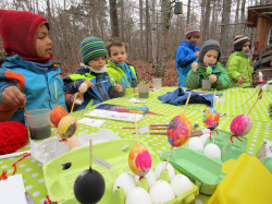 „Bimmel Bammel Beier, lauter bunte Eier...“ singen wir im Morgenkreis, während wir uns an den Händen halten und im Kreis laufen. Wir klopfen ans Türchen der Maus: „Ist dein Nachbar wohl zu Haus“? Das ist nämlich der Osterhase, aber der braucht morgens noch ein ganzes Weilchen, bis er endlich loshüpft. Erst als ein Räuber auf einem großen Gong die Uhr Neune schlagen lässt, ists soweit: ein Kind versteckt dann am Ende des Liedes einen mit bunter Wolle umsponnenen großen Zapfen. Dann gehen wir alle los auf die Suche, wo der Osterhase denn diesmal das Ei im Wald versteckt hat. Und noch mehr bunte Eier warten in der Räuberhöhle darauf, aufgehängt und bestaunt zu werden. Vergangene Woche gab es an drei Tagen je eine große Ostereierbemalaktion. Dank der Unterstützung der Eltern hatten wir einen großen Vorrat an ausgeblasenen Eiern für die Kinder bereit, die sie mit Wasserfarben und Pinsel verzieren konnten. Der Umgang mit den Wasserfarben wurde dabei gleich eingeübt, denn so leicht ist das garnicht, einen kräftig satten Farbton aufs Ei zu bringen und dabei darauf zu achten, dass die Pinsel nicht zu stark gedrückt werden so dass die Borsten gerade bleiben, mit sauberen Pinseln in die Farben zu gehen und dass beim Malen nicht alles ineinander verläuft. Dabei haben wir Großen aber auch gesehen, dass die dünn angerührten, verlaufenden Farben auch ihren Reiz haben, wenn sie nachher in Pastelltönen am Ei getrocknet sind. Bevor wir aber unser Osterfest feiern, gibt es erst einmal noch vier andere Feieranlässe: passend zu den ersten warmen Sonnenstrahlen wünschte sich ein Mädchen, seinen Geburtstag nächste Woche zum Thema Frühling zu gestalten. Und drei weitere Geburtstage schließen sich die darauffolgenden Tage gleich an.