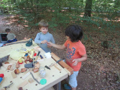 Ein Beutel voll alter Bauklötze und Holzreste lädt zum kreativen Werken an der Werkbank ein. Während ältere Kinder bereits eine Vorstellung haben, was sie bauen wollen (z.B. ein Motorboot) und ihre Klötze dementsprechend zusammenlegen bevor sie sie mit Nägeln und Dübeln verbinden, nehmen sich einige jüngere Kinder nur einen Klotz und spannen ihn in eine Schraubzwinge ein. Mit Hilfe eines Erwachsenen gestalten sie dann die erste Idee davon, was sie damit machen wollen. Ein zweiter Klotz wird ausgesucht. Wie können nun beide miteinander verbunden werden? Die Kinder lernen, wie sie ohne gleich los zu hämmern testen können, ob ein Nagel lang genug ist. Als Alternative können Löcher gebohrt werden, in die dann Dübel als Verbindungsstücke gehauen werden. Für wen das noch zu schwer ist, der kann einfach ein Stück Ast absägen und es mit Dekorstiften bemalen. Ausprobieren darf jeder all das, was er sich zutraut. So passiert es auch immer wieder, dass Nägel krumm geschlagen werden oder einem beim Bohren die Kraft verlässt. Diese Grenzerfahrung motiviert aber auch einige Kinder, sich so richtig anzustrengen und unheimlich stolz darauf zu sein, wenn es dann klappt. Bei den meisten Aktivitäten leisten die Erwachsenen lediglich Hilfe zur Selbsthilfe, nur gelegentlich wird unterstützend eingegriffen. Die Werke sollen so weit wie möglich aus den Ideen der Kinder entstehen und von ihnen gefertigt werden. Wir Erwachsenen neigen schnell dazu, bei den ersten Schwierigkeiten Hilfe zu geben, ohne dass das Kind wirklich an seine Grenzen stößt. So erfahren weder Kind noch Erwachsener, was wirklich in den Kleinen steckt. Das war auch wieder gut am Sommerfest zu beobachten, als einige Kinder am Ende ein Werk in der Hand hielten, das hauptsächlich von den Eltern gefertigt wurde ;)