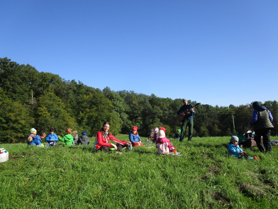 Nur wenige Sonnenstrahlen schaffen es durch das dichte Blätterwerk zu uns in die Räuberhöhle hinunter. Das ist im Hochsommer ein wahrer Segen, doch nun im Herbst zieht es uns raus aus dem Wald um die wärmenden Strahlen auf unserer Haut spüren zu können. Also packen wir den Bollerwagen, hängen die Gitarre um, stimmen ein Liedlein an und ziehen los in Richtung Wiesen und Sonnenschein. Die Stimmung ist heiter und die Gitarrenklänge wärmen das Herz. Weit haben wir es ja nicht, nur die Straße runter zum Wanderparkplatz und schon sind wir da: ein sanfter Hügel erhebt sich über das weite Grün der Wiese. Wir steigen ihn hinauf und werden mit einer unglaublich tollen Aussicht in die Weite belohnt. Der Himmel ist strahlend blau, die Sonne wärmt uns und Musik begleitet dieses schon fast märchenhafte Szenario. Hier vespern wir gemeinsam und schon bald können wir ein paar Schichten Hosen, Jacken und Pullis ablegen. Die Weite der Wiese und der sanft abfallende Hang lädt dazu ein, hinunter zu rennen und zu kugeln. Wir entdecken Herbstzeitlose und nur ein paar Schritte in den Wald hinein breiten sich riesige Baumpilze an vermoderndem Holz aus. Ein wildes, aber doch kontrolliertes Stockkampfspiel entsteht zwischen einem Erzieher und den Kindern. Viele der Jungs freuen sich darüber, ihre Kräfte messen zu können und ihrer Energie im Kampfspiel Ausdruck geben zu können. Da ist es schon ein wenig schade, als die Klingel zum Aufbruch läutet und wir uns auf den Weg zurück zur Räuberhöhle machen. Aber man merkt den Kindern den durchweg gelungenen Vormittag an, die Stimmung ist auch auf dem Rückweg gut, trotz einiger müder Beine. Dass wir noch öfters auf die Sonneninsel wollen, da sind wir glaube ich alle einer Meinung!
