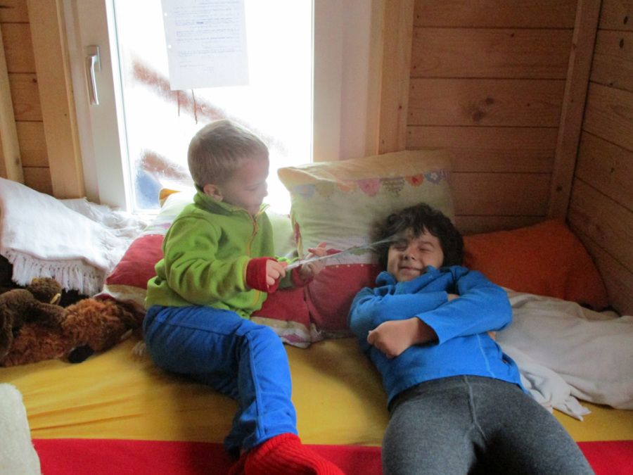 Von Zeit zu Zeit besucht uns der Friedrich-Fröbel-Kindergarten (Kindergarten für Kinder mit Behinderung) mit einer kleinen Gruppe von Kindern. Diesmal waren es fünf Kinder und drei Betreuerinnen. Wir sind meistens schon in den letzten Vorbereitungen zum Vesper, wenn sie gegen 9:30 Uhr eintreffen und sich dazu gesellen. Nach dem gemeinsamen Vesper bieten wir immer Materialien an, welche für alle Kinder zugänglich sind. Das dargebotene Material dient u.a. dazu, kleine Kontaktmöglichkeiten zu erschaffen. Diesmal waren es Musikinstrumente, welche einige Kinder auch gleich nach dem Vesper ausprobierten. Bald verlagerte sich das Spielgeschehen in Richtung Buddelplatz. Eine Räubergruppe hatte bereits vor dem Vesper dort intensiv gespielt und mehreren Räubern bereits das Mitspielen untersagt. Stück für Stück öffnete sich die Gruppe auch anderen Mitspielern, als sich einzelne Gruppenmitglieder dafür einsetzten. Später kam ein Junge der Fröbel-Gruppe und wurde ins Spiel mit aufgenommen. Er holte Sand und füllte ihn in den Kessel der Gruppe. Die Gruppendynamik, in der anfangs viele ausgegrenzt wurden, hatte sich tolerant geöffnet. Zwei Räuber, welche Steine zu Sand verarbeiteten nahmen ganz selbstverständlich ein Mädchen der Fröbel-Gruppe mit in ihr Spiel auf, als dieses sich neugierig zu ihnen gesellte. Die dreijährige Räuberin erklärte ihr, was sie tun und wie sie mitmachen könnte. Auch der fast schon fünfjährige Räuber erklärte: „Du brauchst einen Stein und noch einen, die muss man aneinander reiben“. Mit Hilfe einer Feile ging es dann noch leichter und alle drei rieben gemeinsam ihre Steine zu Sand fein. Das Mädchen achtete immer genau darauf, was die beiden taten und ahmte sie nach.