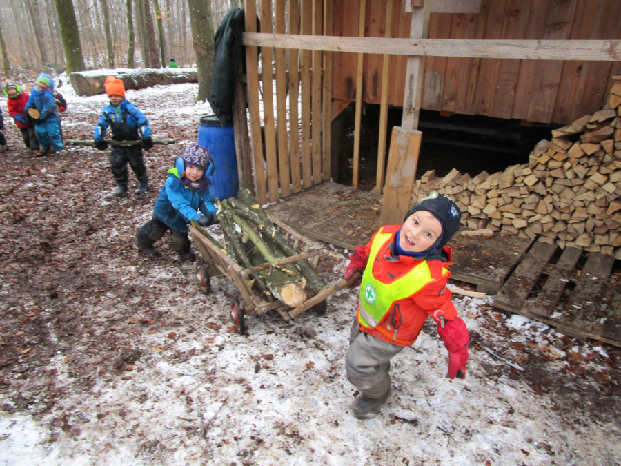 Mit anzupacken wenn die Erwachsenen einen Arbeitseinsatz in der Räuberhöhle haben, ist für viele Kinder eine besonders wertvolle Erfahrung. Als vergangenen Freitag einige Eltern mit Motorsägen, Schubkarren, Wannen und Astschere die Arbeit aufnahmen, um das vom Forstamt gesponserte Holz klein zu sägen und zu stapeln, waren die Kinder gleich Feuer und Flamme und packten tatkräftig mit an. Gemeinsam stapelten wir das alte Holz um, damit Platz für das Neue ist. Wir trugen die zugeschnittenen Äste zum Lagerplatz und stapelten sie auf. Immer wieder riefen die Kinder „Schau mal!“ und „Guck mal, wie stark ich bin!“, als sie alleine oder zu zweit stolz einen dicken Ast trugen oder den voll beladenen Bollerwagen mit vereinten Kräften vorwärts bewegten. „Puh, das ist ganz schön anstrengend, ich schwitze schon!“ meinte ein vierjähriger Junge. Auf die Frage, ob er eine Pause machen wolle, winkte er ab. „Nein, ich muss noch weiter arbeiten, ich bin ja ein Waldarbeiter!“ und schnappte sich den nächsten Ast. Doch auch Waldarbeiter brauchen irgendwann eine Rast. „Ich mach mal Pause und geh vespern.“ bemerkte ein junger Waldarbeiter nach intensivem Arbeitseinsatz. Und als auch die Erwachsenen Pause machten, gab es leckere Butterbrezeln. Da kam plötzlich eine Überraschung angerollt: Herr Eipper aus Mönchberg kam zu uns hoch gefahren und brachte ein kleines Zicklein und einen Jährling mit, die bei uns fröhlich durch die Räuberhöhle sprangen und spazierten. Das war so lustig anzusehen, wie das Kleine seine übermütigen Sprünge zwischen uns machte. Das war wirklich eine gelungene Überraschung, die uns sehr erfreute. Nach dieser schönen Pause arbeiteten wir gemeinsam noch eine ganze Weile weiter und am Ende dieses produktiven Einsatzes versammelten wir uns gemeinsam um die Holzstapel und dicken Stammstücke, beglückwünschten uns gegenseitig und schossen noch ein Abschiedsfoto, welches die Kinder zur Erinnerung in ihre Portfolios abgeheftet bekommen.