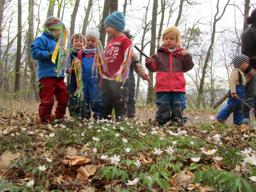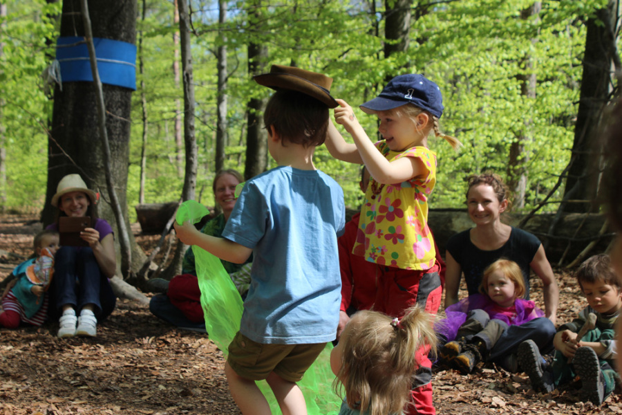 Im Schimmer der Lindgrünen Buchenblätter versammelten sich vergangenen Freitag die Familien der Räuberkinder bei herrlich warmem Wetter auf dem Gelände des Waldkindergartens. Eine sehr entspannte Woche lag hinter uns: Wir waren bei den Schafen einer Räuberfamilie zu Besuch gewesen. Zwischen all den blühenden Bäumen und den grünen Wiesen konnten wir die kleinen Lämmer beobachten. Wir feierten einen Drachengeburtstag und halfen ein wenig bei der Brennholzaufbereitung mit. Ansonsten genossen wir einfach viele sehr entspannte Momente im Frühlingswald. Mit dem Grünen der Buchen war es dann auch soweit, dass wir gemeinsam unser traditionelles Frühlingsfest feiern wollten. Der Tisch wurde mit bunten Tüchern und Blumensträußen verziert und ein umfangreiches Buffet wurde aufgetischt. Dann machten wir es uns auf dem trockenen Waldboden in einem großen Kreis gemütlich, die Kinder teils auch auf dem Schoß ihrer Eltern. Was wir in den vergangenen Wochen immer wieder im Morgenkreis gespielt und gesungen hatten führten die Kinder nun in der Kreismitte vor. Mit bunten Chiffontüchern verwandelten sie sich in Blumen, Tiere, Sonne oder Regen. Das Schneeglöckchen bimmelte seine Blumenschwestern hervor, bevor es selbst wieder einschlief. Schmetterling und Käfer flogen und krabbelten über die Blumenwiese und eine Hummel besuchte die Blütenkelche. Ein Vogel baute sein Nest im Baum und die Vogeleltern fütterten ihre hungrigen Kinder. Als die Vögel flügge wurden flogen alle davon und es war die Zeit gekommen, dass auch wir uns am leckeren Buffet satt essen konnten. So klang ein warmer, fast schon sommerlicher Kindergartentag in gemütlicher Runde aus.