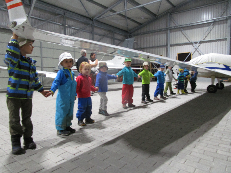 Eine ereignisreiche Woche liegt hinter uns. Schon der Montag brachte uns auf einem Spaziergang einige Überraschungen: in einer großen Pfütze entdeckten wir einen jungen Feuersalamander. Er schwamm freiwillig in unser Lupenglas und ein Kind organisierte die Gruppe so, dass alle im Kreis standen und nacheinander das Tier gezeigt bekamen. Dann fanden wir auch noch eine Kaulquappe, eine kleine Erdkröte und zwei große Kröten. Ein richtiger Entdeckerspaziergang! Am Donnerstag zogen wir hinunter nach Mönchberg auf eine Kirschwiese, auf der wir so viele Kirschen ernten durften wie wir nur essen konnten. Das war eine Freude und die Stimmung war bestens, als die Kinder durch das hohe Gras streunten, auf Bäume kletterten und in kleinen Gruppen gemeinsam die roten Früchte naschten. Am Freitag dann trafen wir uns beim Flugplatz Poltringen. Dort bekamen wir eine Führung durch die Flugzeughallen. Die Kinder konnten sich Motor- und Segelflugzeuge ganz genau anschauen und sich auch mal hinein setzen. Uns wurden auch die Seilwinde und die großen Anhänger gezeigt und anhand eines Modellflügels wurde anschaulich gemacht, wie der Auftrieb funktioniert. Wir bildeten eine Menschenkette und zählten, wie viele Kinder der große Flügel des Segelfliegers lang ist. Später dann versuchten wir noch einen großen Fallschirm in die Lüfte zu bringen. Kurz schwebte er über dem Boden doch der Wind war leider zu schwach. Später holte ein Kind mit einer Betreuerin noch unser Therapiepferd Nanu und ein paar Kinder hatten noch das Vergnügen, ausnahmsweise einmal ohne Sattel und barfuß zu reiten und direkt den starken Rücken und das weiche Fell des Pferdes unter sich zu spüren. Gegen Ende des Kindergartentages experimentierten wir auf der Wippe des anliegenden Spielplatzes mit den Gewichten der Kinder und uns Erwachsenen. Wie bekommen die Kinder eine Erzieherin hoch, wer ist schwerer oder leichter und woran erkennt man das? Auch ein paar Mütter beteiligten sich noch am Spiel und so ging die Räuberwoche vergnüglich zu Ende.