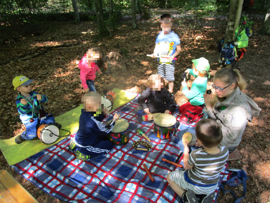 Bevor uns die Fröbelgruppe gegen 11 Uhr verließ, musizierten wir noch einmal gemeinsam zu dem Lied, welches die Kinder aus dem Morgenkreis kennen: „Was müssen das für Bäume sein“ und nutzten dazu Trommeln, Rasseln, Ratschen und weitere Instrumente.