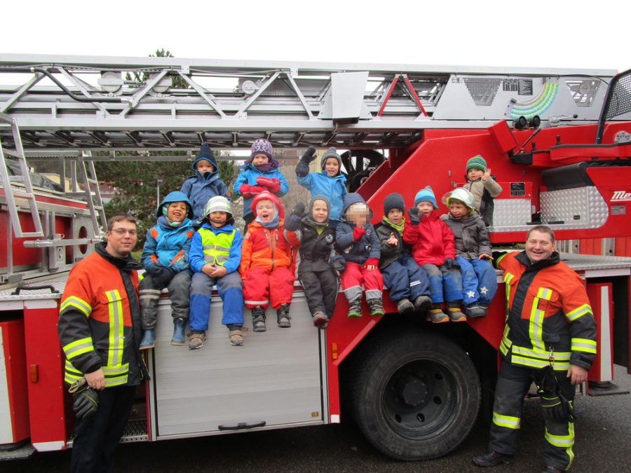 Das macht Eindruck: als die Räuberkinder vorbei an der ordentlich aufgeräumten Garderobe der Feuerwehrleute vorbeigeführt werden, schauen sich viele staunend und neugierig um. Die großen Stiefel, die schweren Jacken und all die Helme – wow! Das wollen sie sich nacher genauer anschauen. Doch erstmal geht’s in den Seminarraum, wo alle Kinder ganz wie Erwachsene auf großen Stühlen an großen Tischen platz nehmen und Herr Jochen Schopp lauschen, der als Papa eines Räuberkindes die ganze Aktion in Gang gesetzt hat. Über einen Beamer zeigt er den Kindern Bilder und einige Räuber tragen ihr Wissen über die Feuerwehr bei. Mit einem weiteren Feuerwehrkollegen gehen wir dann wieder zur Garderobe und nun ziehen die beiden ihre Arbeitskleidung an. Die Kinder dürfen auch mal den Helm aufsetzen oder die schweren Stiefel heben. Nach einer Vesperpause geht es in zwei Gruppen los in die Fahrzeughalle. Da gibt es wirklich viel zu entdecken und es wird gestaunt, gefragt und ausprobiert. Wir setzen uns auch mal alle in einen Feuerwehrwagen rein, schauen uns die Atemschutzmasken und Funkgeräte an, machen das Blaulicht an, betrachten die vielen Werkzeuge und erfahren wofür sie gebraucht werden. Die Kinder sind ganz bei der Sache und man merkt ihnen das große Interesse und ihre hohe Motivation und Aufmerksamkeit an. Hier gibt es wirklich für jeden etwas interessantes zu entdecken. Und dann fährt sogar noch ein Drehleiterwagen raus und wir dürfen alle dort hinauf und so entsteht ein Gruppenfoto mit vielen glücklichen Räubern, von denen jetzt schon einige sagen, dass sie später mal zur Feuerwehr wollen. Ab 10 Jahren kann man dort starten, ein wenig Geduld braucht es also noch. Im Sommer wollen wir wieder kommen, dann dürfen wir auch mal Wasser spritzen.