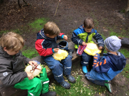 Bei Streifzügen durch die Sandgrube finden wir viele verschieden Pilze, die, im Laub versteckt, aus dem Boden oder aus alten Hölzern und Baumstümpfen sprießen. Zum Wochenausklang essen wir gemeinsam