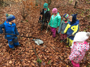 Diese Woche haben wir außerdem noch eine Umgestürzte Kiefer entdeckt, die uns unweit der Räuberhöhle wunderbare Möglichkeiten zum spielen, kletten und balancieren bot. Wir haben geschnitzt, mit Gitarre und Perkussionsinstrumenten musiziert und das wunderbare Pfützenwetter genutzt. Es ist doch herrlich, durch Pfützen zu springen, zu kochen und zu matschen! Zur Sicherheit haben wir dann immer noch einen Ofen, Wechselklamotten und zu Hause gibt es Duschen, Badewannen und Waschmaschinen.