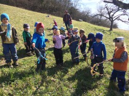 An den steilen Wiesen des Grafenberges konnten wir dann aber doch noch eine Schlüsselblume und jede Menge kleiner lila Veilchen und sogar einen Marienkäfer sehen. An den Ziegen vorbei ging es zu Annas Wiese, wo wir noch einmal gemeinsam den Sonnenschein genießen konnten bevor dann auch schon die ersten Eltern zur Abholzeit ankamen.
