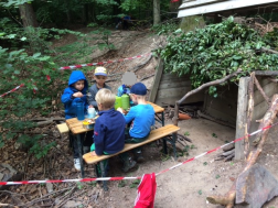 Ebenfalls weitergearbeitet wurde an dem Projekt der Räuberkinder, zusätzlich zu den bestehenden Arbeitsgruppen „Geld“ und „Zug“ hat sich die „Eisdielengruppe“ gebildet, die kurzerhand einen der großen Baumstämme, die in der Räuberhöhle liegen, zu einer Eisdiele umfunktioniert und selbstgebasteltes Papier-Eis anbietet. Traditionell wird das Eis sowohl in der Waffel, als auch im Becher angeboten, ungewöhnlich sind nur die angebotenen Sorten. Beispielsweise gibt es