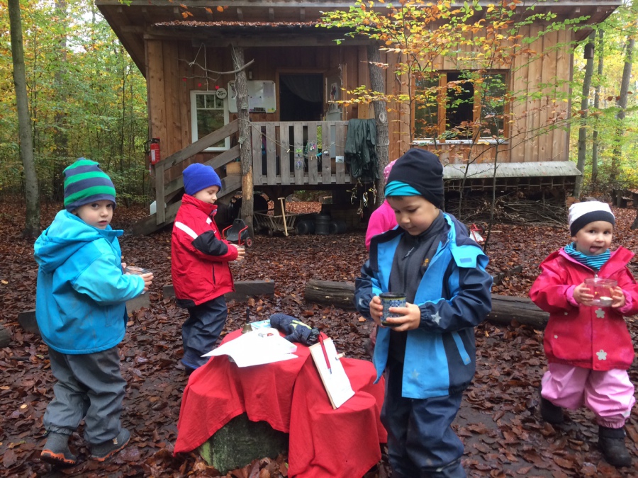 „Wer klingt und klettert durchs Gestein? Eins, zwei, drei, vier klein Brüderlein.“ Aufmerksam lauschen die Kinder dem Text des ersten Laternenliedes diesen Jahres, es erzählt von vier Wichteln, die ihre Kerzchen anzünden und durch das Dunkel tragen. Auch die Kinder der Räuberhöhle, in kleinem Kreis versammelt, zünden je eine Kerze an und tragen sie durch den Morgenkreis, wenn im Lied der Name des richtigen Wichtels genannt wird. Der Herbst schreitet voran, es wird grauer, nasser und kühler. Wir stimmen uns mit Laternenliedern ein. In dieser sehr kurzen Woche erleben wir in der Räuberhöhle einmal mehr, dass Gemütlichkeit auch draußen stattfinden kann, grauer werdende Herbstzeit hin oder her. Selbst der verregnete Dienstag lässt sich dank des Tarps und unserer Regenjacken auch draußen in wunderbar entspannter Stimmung verbringen, endlich ist einmal Zeit, das Zweig - Tipi neu aufzubauen. Der Herbstferien wegen bleiben viele Kinder mit größeren Geschwistern zuhause, so lichtet sich auch unsere Gruppe und wir verbringen unsere Vormittage in sehr kleinem Kreis. Ein klarer Höhepunkt der kurzen Woche ist der Geburtstag von einer unserer Jüngsten, den wir gebührend mit Geburtstagsmorgenkreis, Zwergennest – Suche und gemeinsamen Kuchenessen feiern. Die Projektarbeit werden wir in der kommenden Woche wieder aufnehmen, wenn wir wieder vollzählig versammelt sein werden.