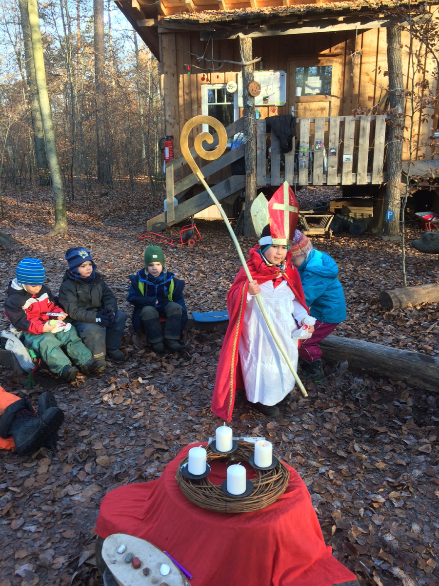 Lustig, lustig, tralalalala... Die ganze vergangene Woche über darf im Morgenkreis der Räuberhöhle je ein Kind seine Adventssocke öffnen, die - alle hintereinander an einer Schnur befestigt - quer durch die Hütte aufgespannt den Adventskalender des Waldkindergartens bilden. Mit jedem verstreichenden Tag steigt dabei die Vorfreude auf den Nikolaus. Am Freitag ist es dann endlich soweit: nach der Adventssocke und den Nikolausliedern verkleidet sich eines der Räuberkinder: als der Bischof Nikolaus läuft es mit Mitra, Brustkreuz, Bischofsstab und Ring durch den Kreis und verteilt, gemeinsam mit seinem Gehilfen, Gaben an die Kinder. Weil das Verkleiden so großen Spaß macht geht es nach dem Morgenkreis weiter, nachdem sich alle in der warmen Hütte mit bei einer Vesperrunde gestärkt haben. An einem Baumstamm lehnt ein großer Spiegel, daneben steht ein Tisch, auf dem die Insignien des heiligen Nikolaus ausgebreitet auf ihren Einsatz warten.