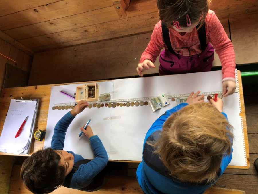 Arbeitsgruppe Geld sitzen hier um den Tisch, draußen toben die restlichen Räuber lärmend im Matsch. Auf dem Tisch aufgereiht liegt eine Hand voll verschiedener Münzen, über die sich die