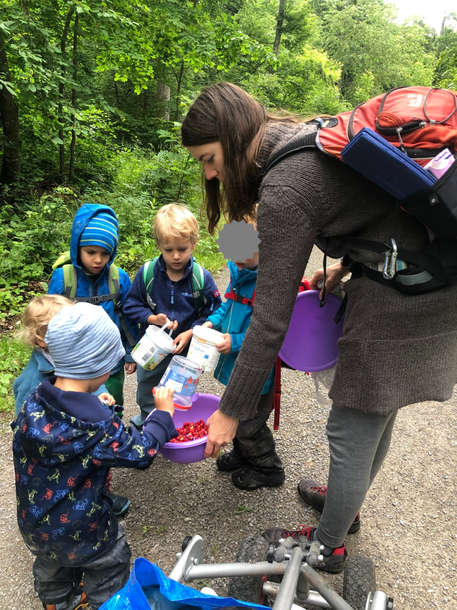 „Ich hab noch eine!“ - „Guck mal hier sind noch ganz viele!“ So hörte man es diesen Freitag durch den Wald schallen. Ausgerüstet mit kleinen Eimerchen waren wir Räuber im Wald unterwegs, um Erdbeeren zu sammeln. Nachdem wir eine ganze Weile fleißig gesucht und gesammelt hatten, suchten wir uns ein gemütliches Plätzchen für das Vesper. Nach dem Essen gab es dann unsere Walderdbeeren. Tatsächlich war der Geschmack aber nicht jedermanns Sache, die kleinen Früchte waren so manchen Räubern einfach im Vergleich zu den bekannten Gartenerdbeeren zu sauer. Andere trauten sich gar nicht, etwas davon zu probieren. Immerhin ließen sich ein kleinerer und zwei große Räuber die Beeren aber als Nachtisch schmecken. Wie schön, dass wir den Wald sogar mit dem Geschmackssinn erleben können!