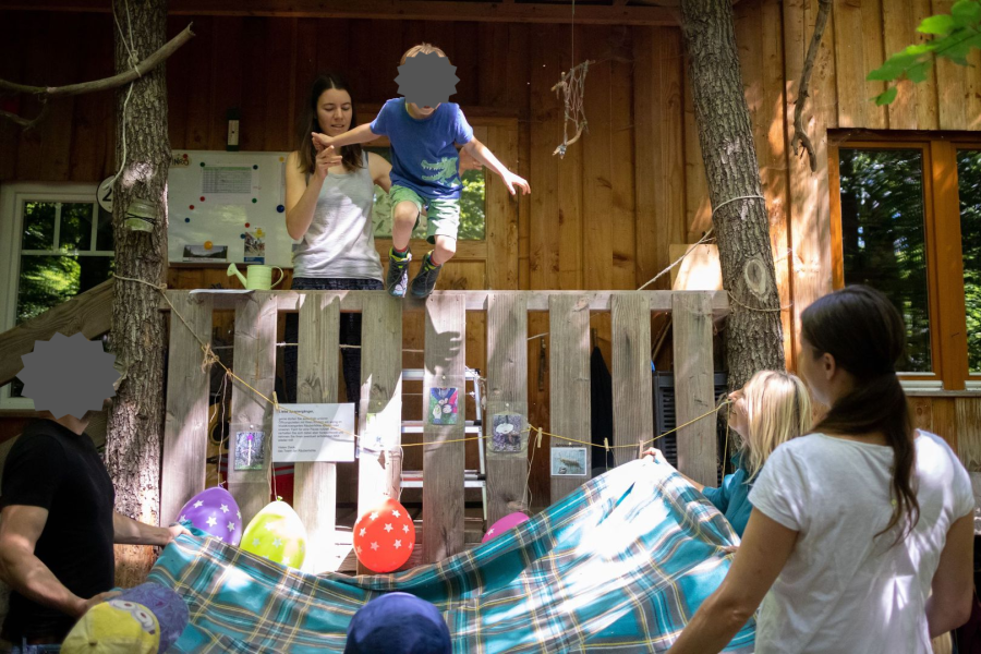 Dieses Jahr durften wir bei perfekten sommerlichen Temperaturen nur einen Räuber in die Schule verabschieden. Coronabedingt mussten wir einige Einschränkungen in Kauf nehmen, aber auch ohne Buffet konnten wir standesgemäß feiern. Die Eltern des Kindes konnten mit dem notwendigen Abstand teilnehmen. Wir sangen gemeinsam „Wer wird in die Schule gehen“. Mit einem beherzten Sprung vom Balkon verwandelte sich das Kind für uns Räuber in ein Schulkind und bekam eine Sonnenblume überreicht. Es gab anschließend als diesjährige Besonderheit eine wilde Party mit (vom Schulkind bevorzugter) Rockmusik, welche von den Kindern mit Trommeln, Djemben und Perkussionsinstrumenten begleitetet wurde.