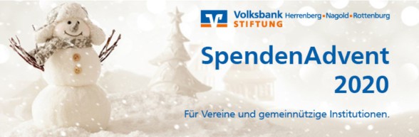 Im Rahmen der Aktion „SpendenAdvent“ schüttete die Volksbank Herrenberg-Nagold-Rottenburg-Stiftung über die Adventszeit einen Spendenbetrag von insgesamt 108.000 Euro aus. Mit den aus dem Zweckertrag des VR-GewinnSparens stammenden Fördermitteln werden soziale, gemeinnützige, mildtätige und kirchliche Projekte im Geschäftsgebiet der Bank unterstützt
